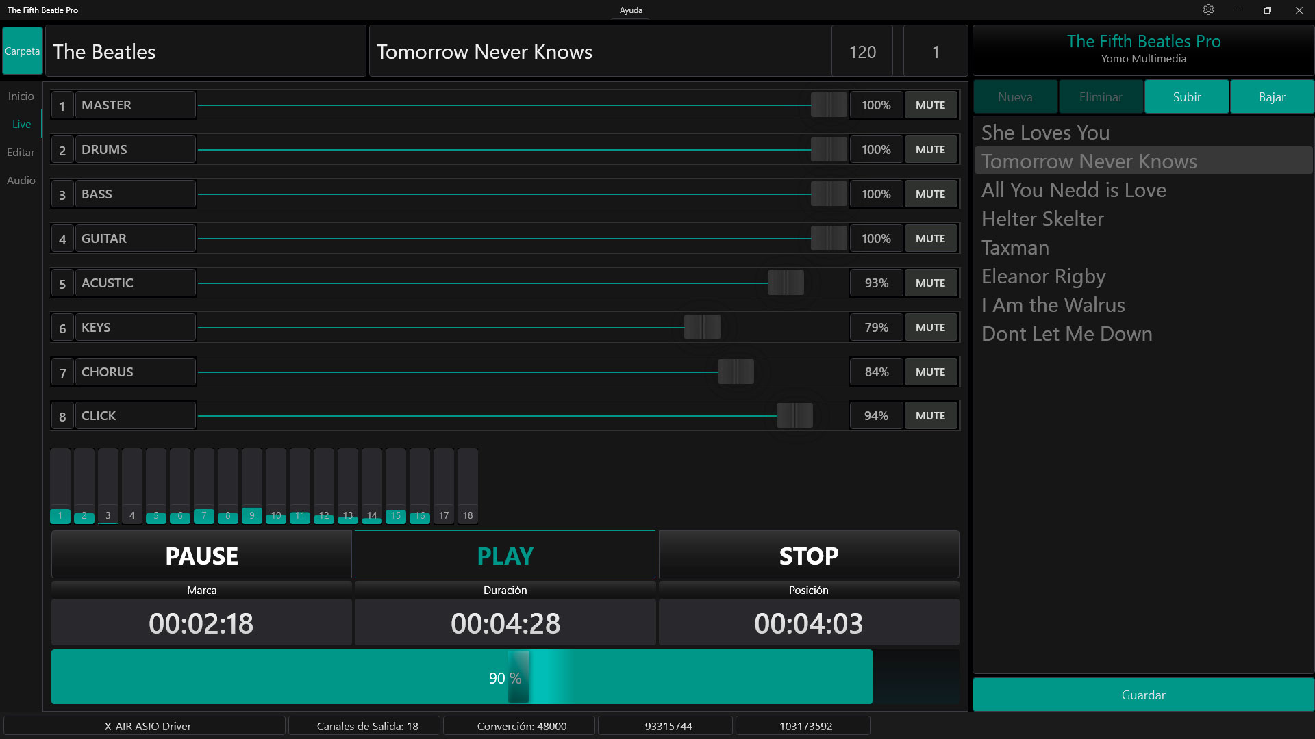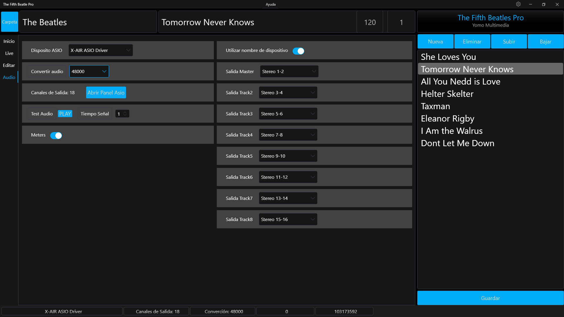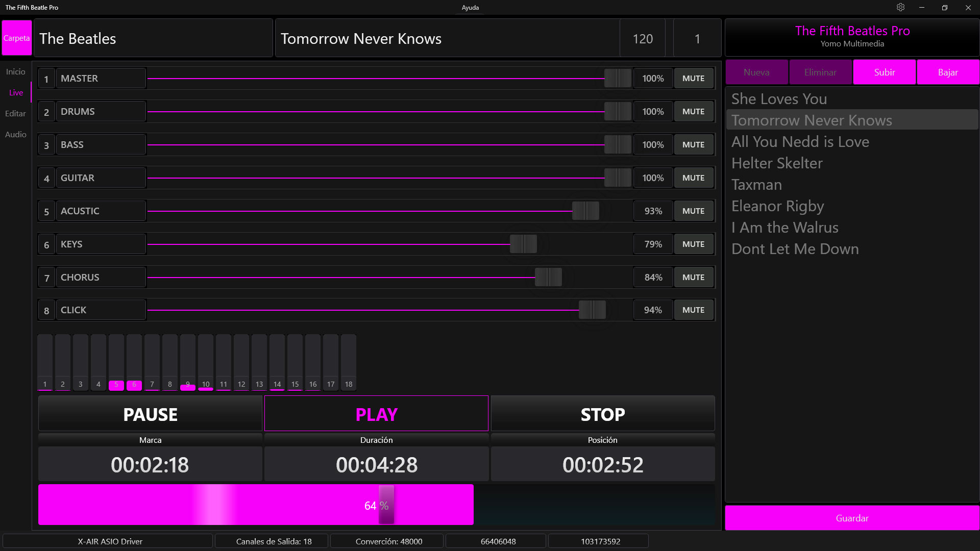 The Fifth Beatle Pro es una aplicación para disparar pistas de acompañamiento para Windows. Funciona con Dispositivos ASIO y puede manejar hasta 8 pistas estéreo con salidas independientes. La cantidad de salidas dependerá del dispositivo ASIO utilizado. Preparar el show en casa o en el ensayo y olvidarse de todo el día del concierto, solo habrá que hacer Play para que todo funcione.