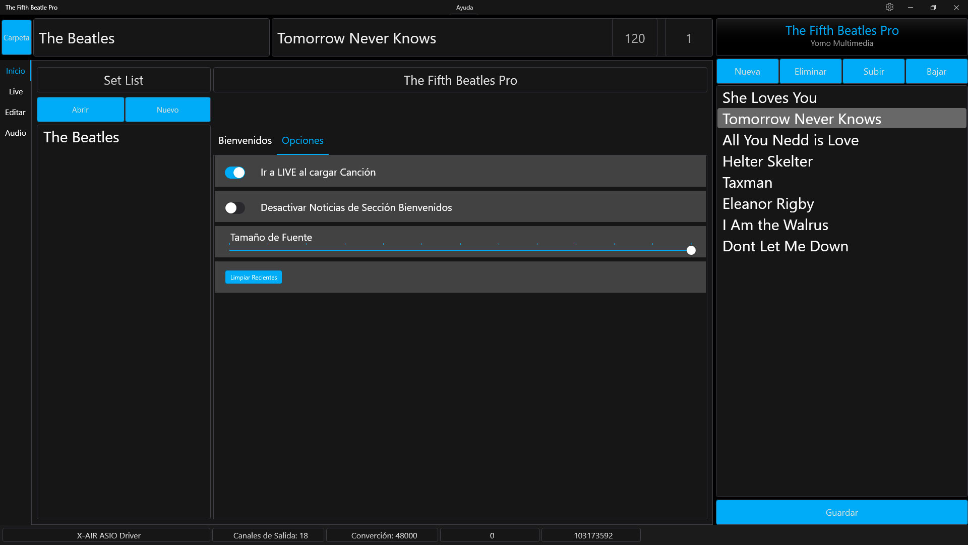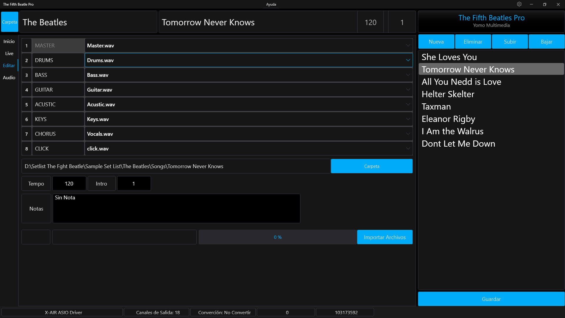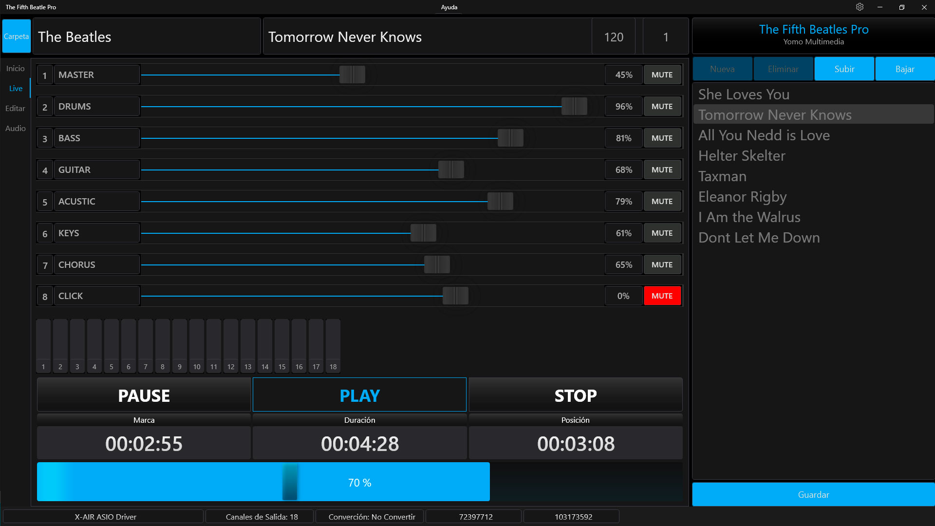 The Fifth Beatle Pro es una aplicación para disparar pistas de acompañamiento para Windows. Funciona con Dispositivos ASIO y puede manejar hasta 8 pistas estéreo con salidas independientes. La cantidad de salidas dependerá del dispositivo ASIO utilizado. Preparar el show en casa o en el ensayo y olvidarse de todo el día del concierto, solo habrá que hacer Play para que todo funcione.